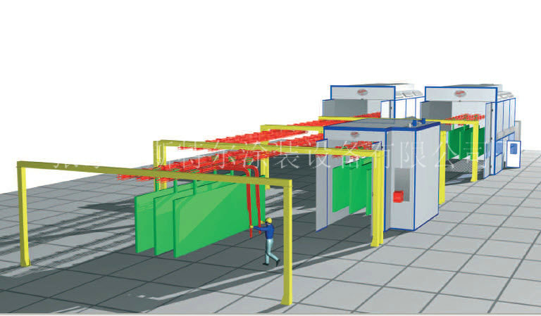 氣流鏈板輸送機依照制作工藝環節進行合理合法的布局合理開發,協調各加工工藝技術(前處置、噴粉室、上漆室、凝固烘道等),減輕高空作業員工,還縮短加工周期長,提加工工作效率。